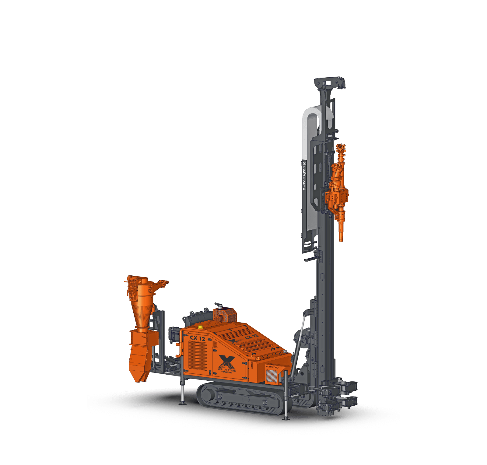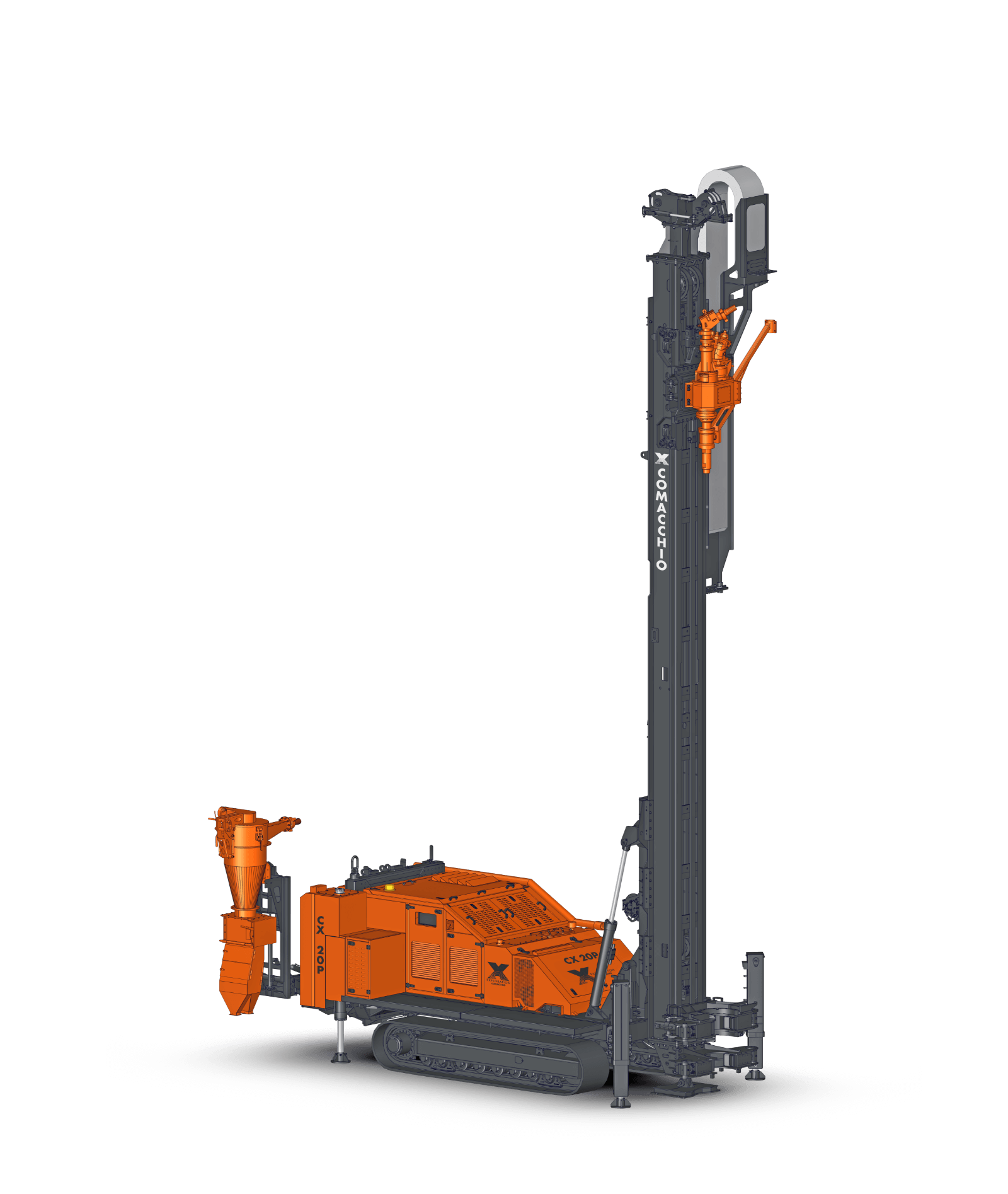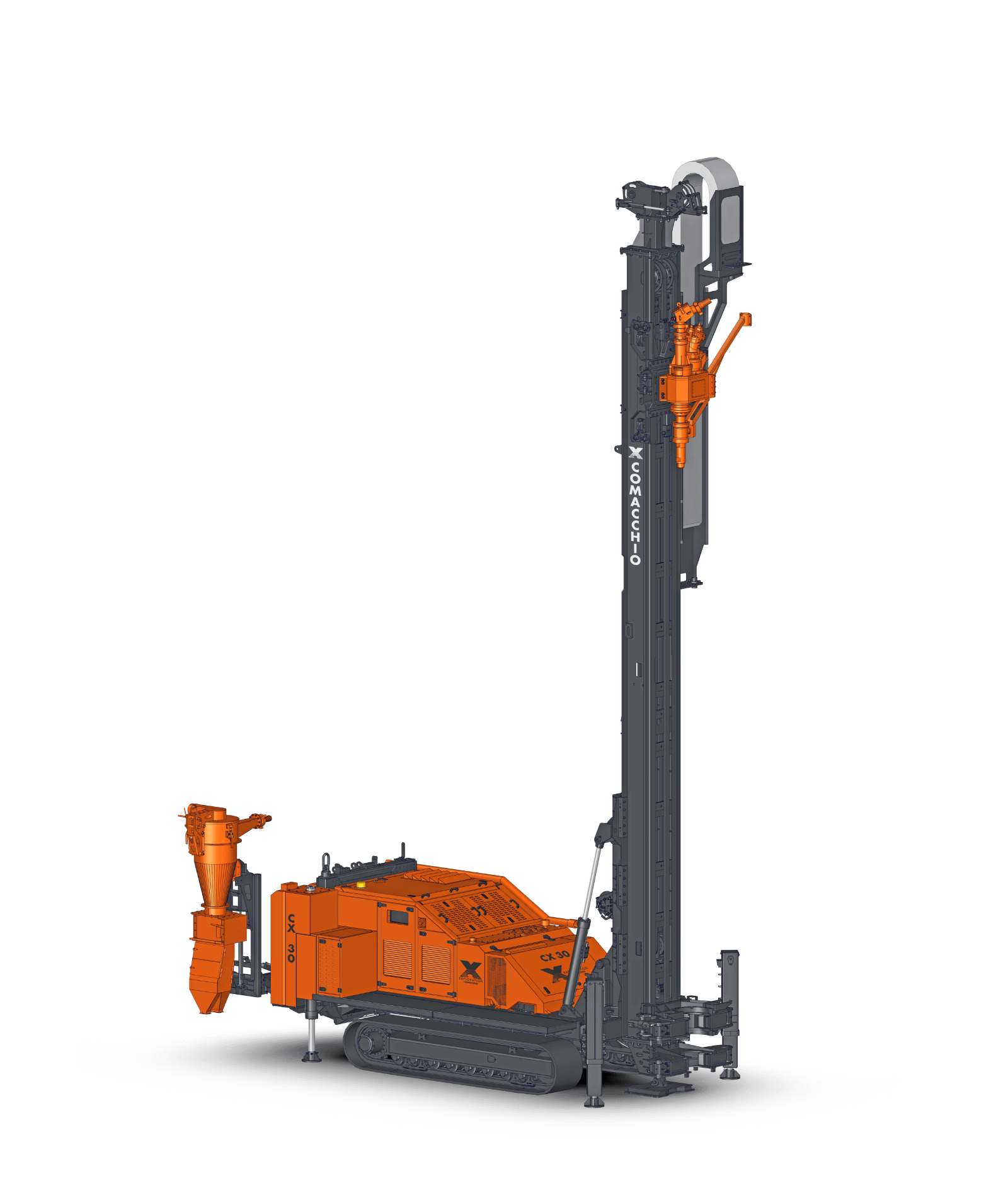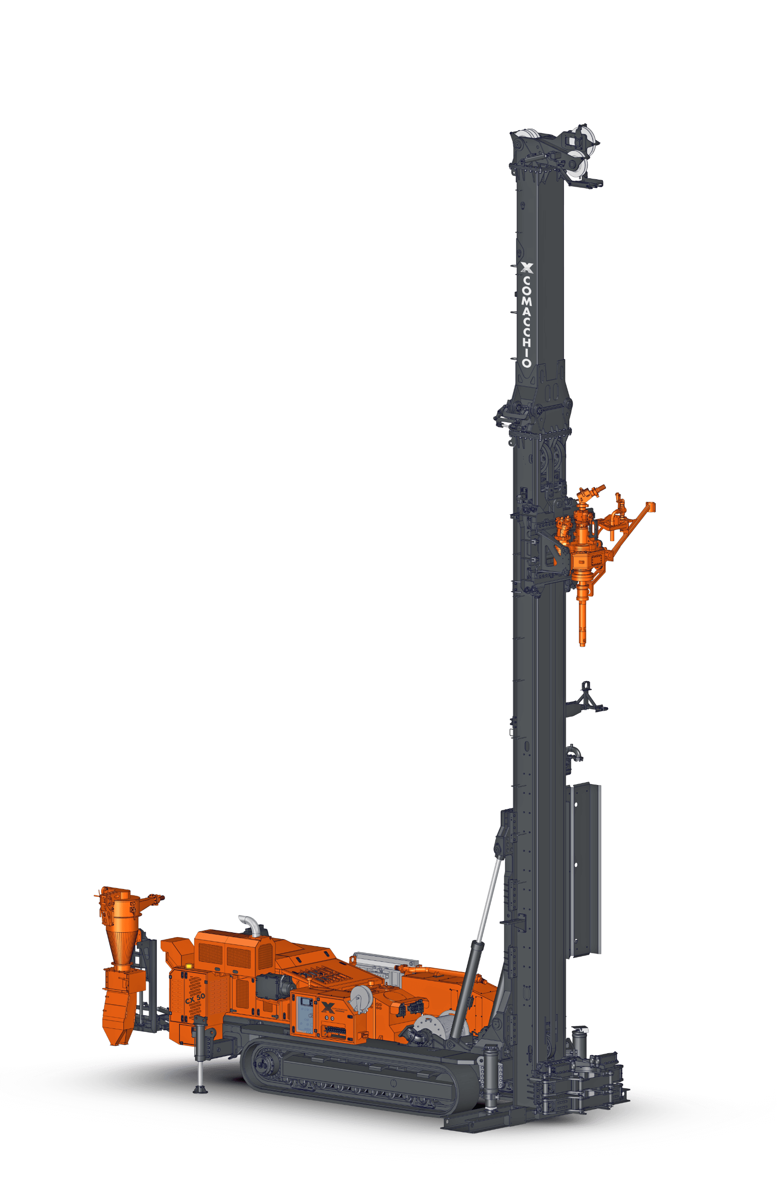 Comacchio X reverse circulation rigs are built on CRAWLER or TRUCK-MOUNTED carriers, providing excellent mobility across a wide range of working conditions. A robust frame and reinforced mast design ensure accurate drill string alignment and structural stability, even during angled and inclined drilling operations. These high-performance rigs integrate advanced modular hydraulic circuits, enabling optimal power distribution to critical systems such as high-torque rotary heads, high-capacity air compressors, and cyclone sampling units. This fully integrated design ensures efficient energy transfer, consistent drilling performance, and maximum productivity in demanding RC applications. Operator protection is a key design priority. The rigs are equipped with guarded components, automated drilling controls, and optional hands-free rod handling systems, significantly reducing exposure to hazards, minimizing operator fatigue, and improving overall safety and operational efficiency on site.