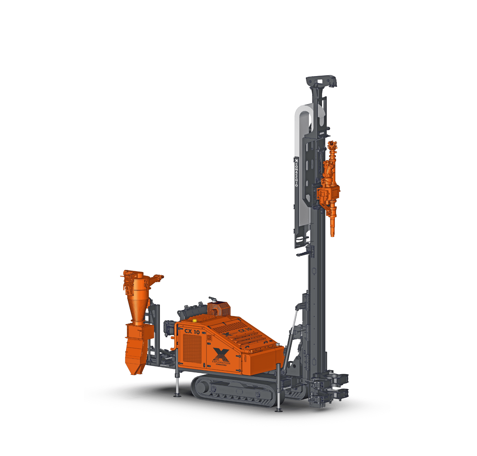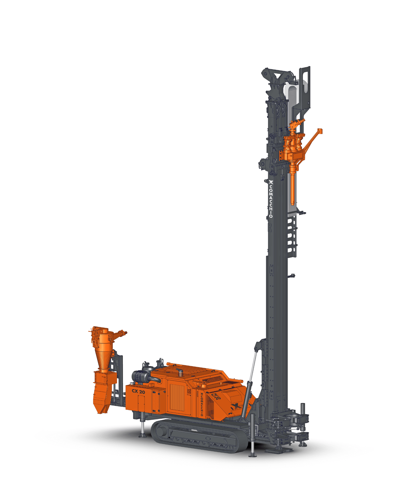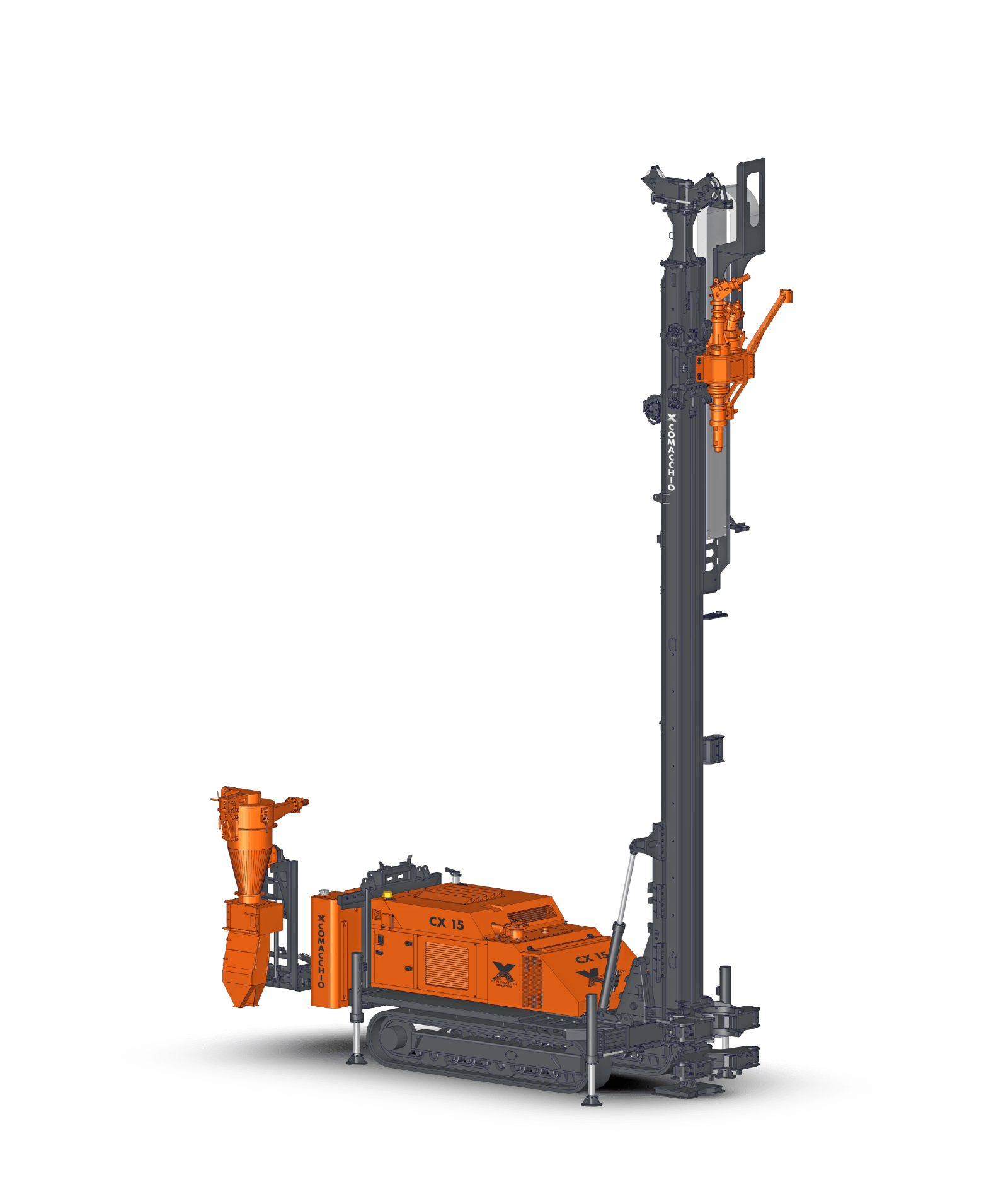 Comacchio X reverse circulation rigs are built on CRAWLER or TRUCK-MOUNTED carriers, providing excellent mobility across a wide range of working conditions. A robust frame and reinforced mast design ensure accurate drill string alignment and structural stability, even during angled and inclined drilling operations. These high-performance rigs integrate advanced modular hydraulic circuits, enabling optimal power distribution to critical systems such as high-torque rotary heads, high-capacity air compressors, and cyclone sampling units. This fully integrated design ensures efficient energy transfer, consistent drilling performance, and maximum productivity in demanding RC applications. Operator protection is a key design priority. The rigs are equipped with guarded components, automated drilling controls, and optional hands-free rod handling systems, significantly reducing exposure to hazards, minimizing operator fatigue, and improving overall safety and operational efficiency on site.