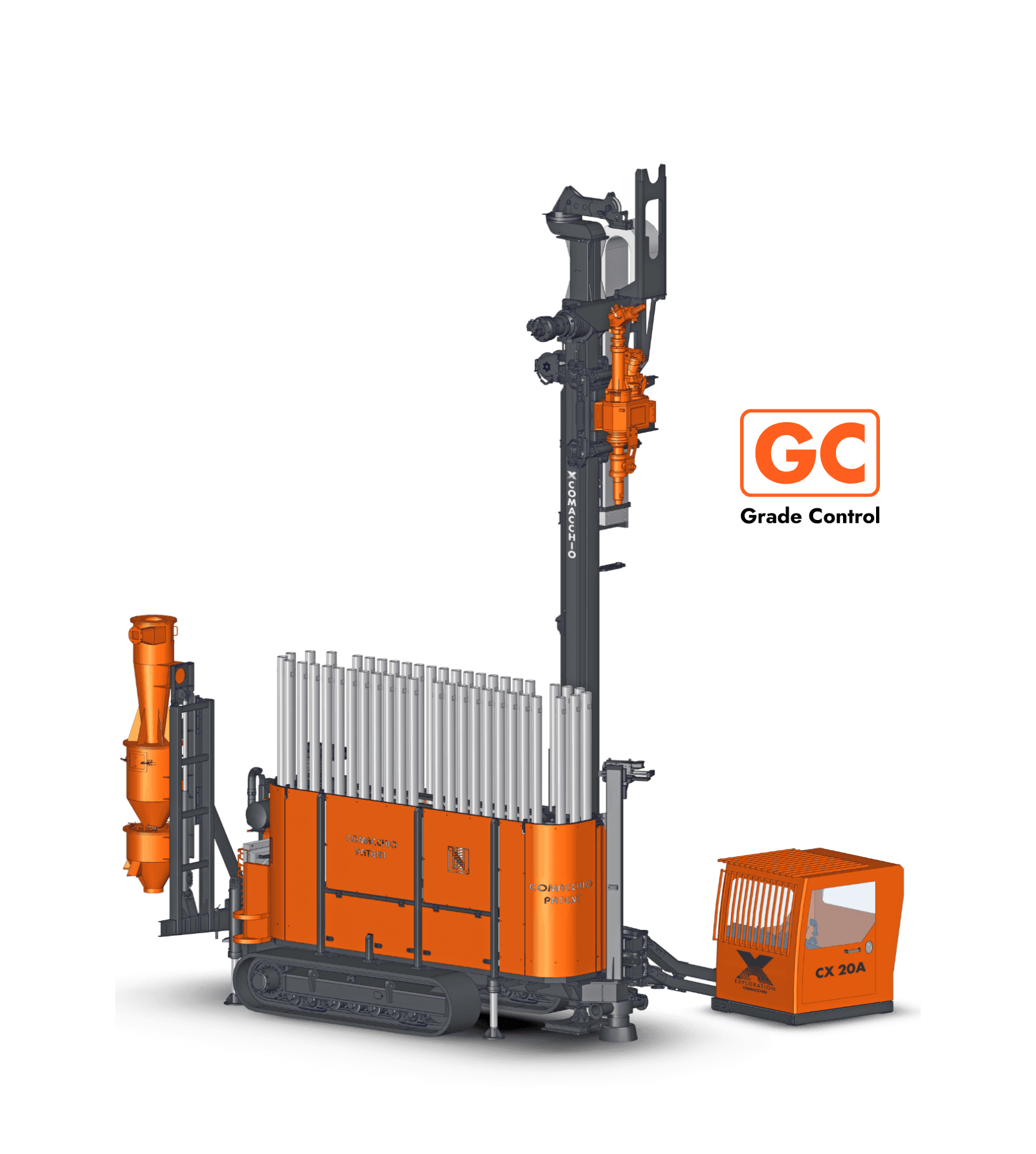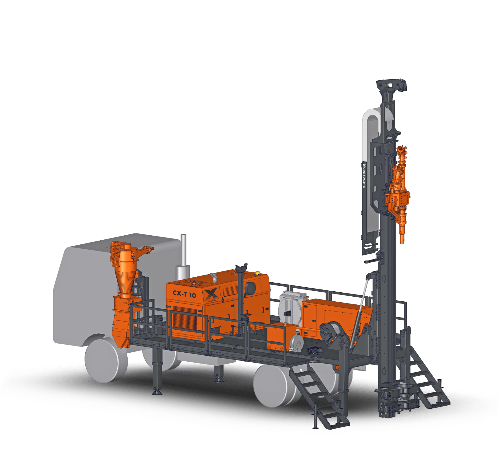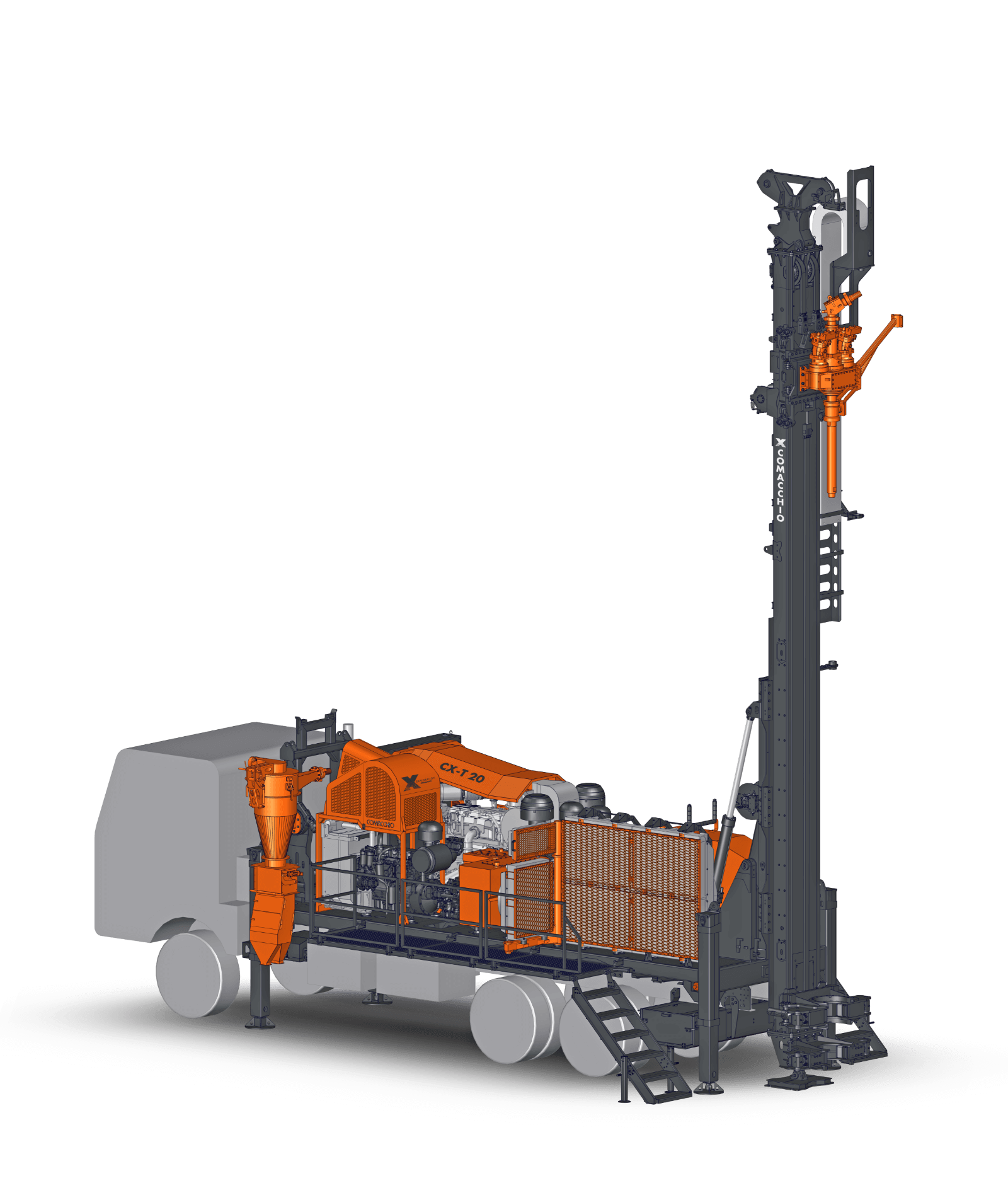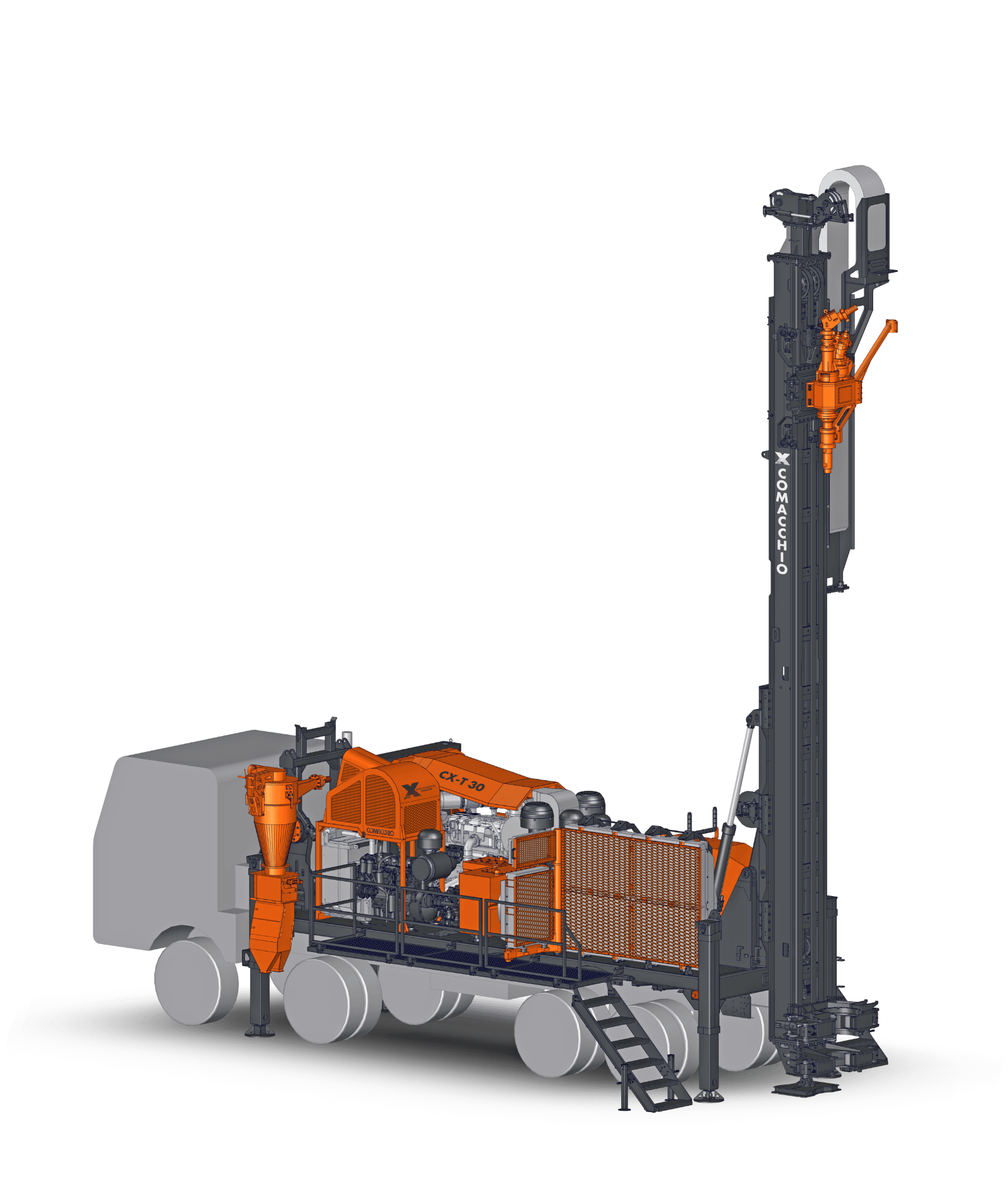 Comacchio X reverse circulation rigs are built on CRAWLER or TRUCK-MOUNTED carriers, providing excellent mobility across a wide range of working conditions. A robust frame and reinforced mast design ensure accurate drill string alignment and structural stability, even during angled and inclined drilling operations. These high-performance rigs integrate advanced modular hydraulic circuits, enabling optimal power distribution to critical systems such as high-torque rotary heads, high-capacity air compressors, and cyclone sampling units. This fully integrated design ensures efficient energy transfer, consistent drilling performance, and maximum productivity in demanding RC applications. Operator protection is a key design priority. The rigs are equipped with guarded components, automated drilling controls, and optional hands-free rod handling systems, significantly reducing exposure to hazards, minimizing operator fatigue, and improving overall safety and operational efficiency on site.